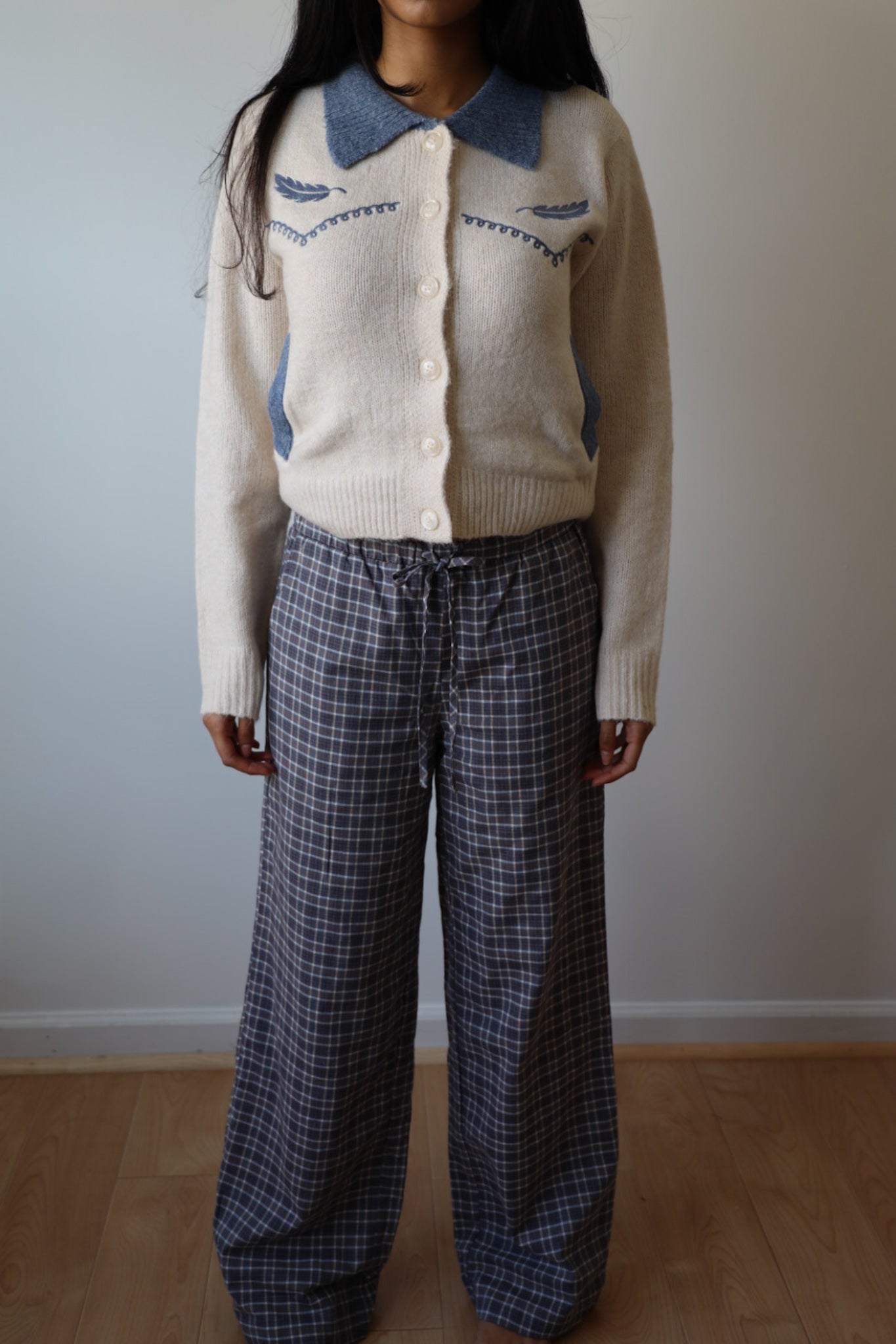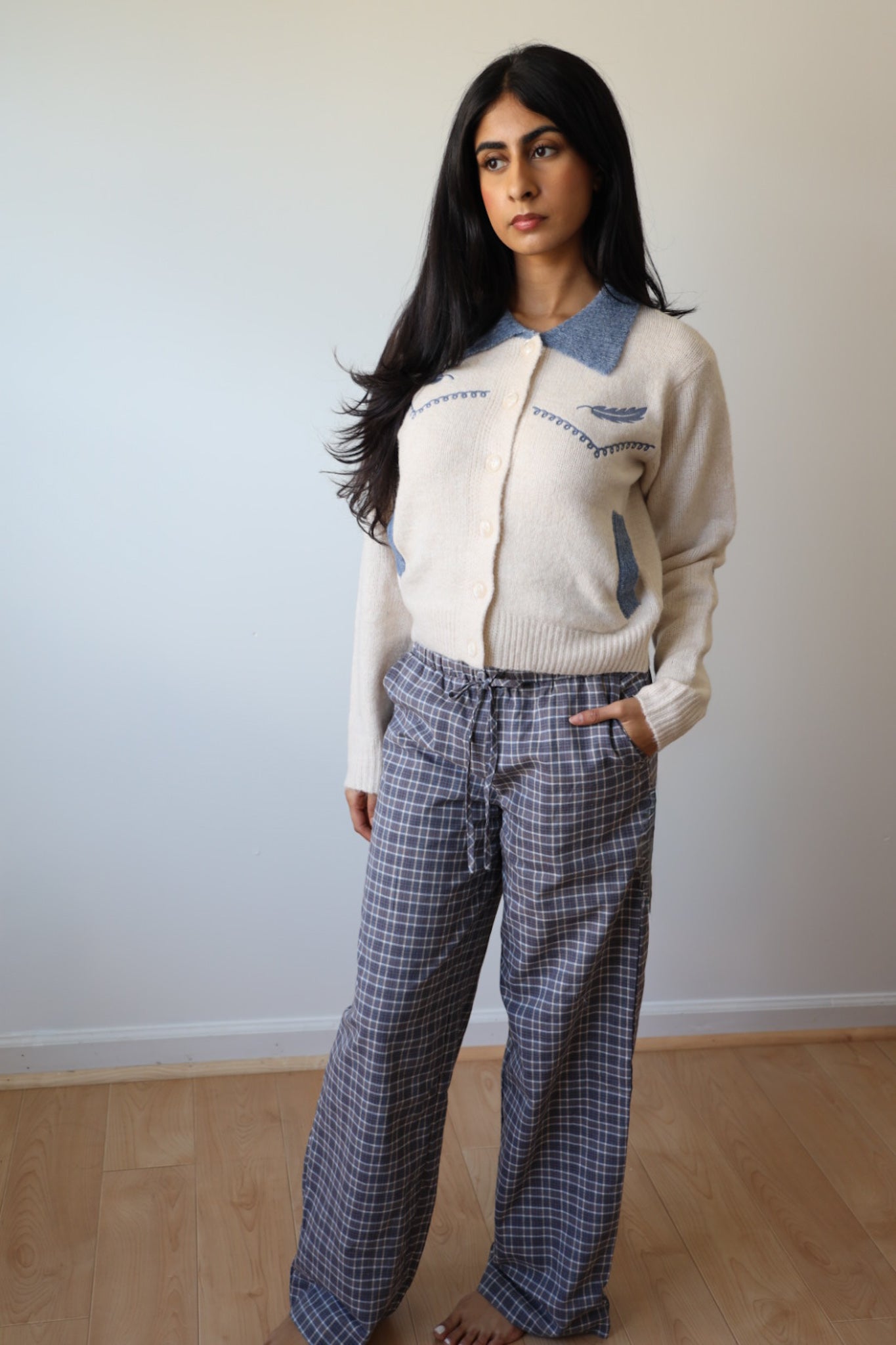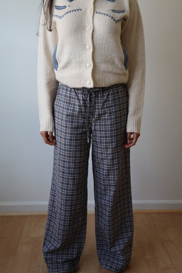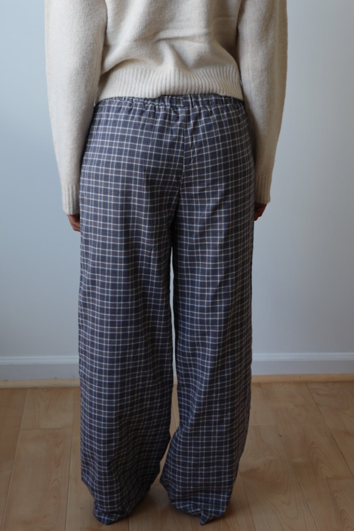 Tags: charcoal plaid lounge pants, check wide-leg pants, cozy winter lounge, off-duty chic bottoms