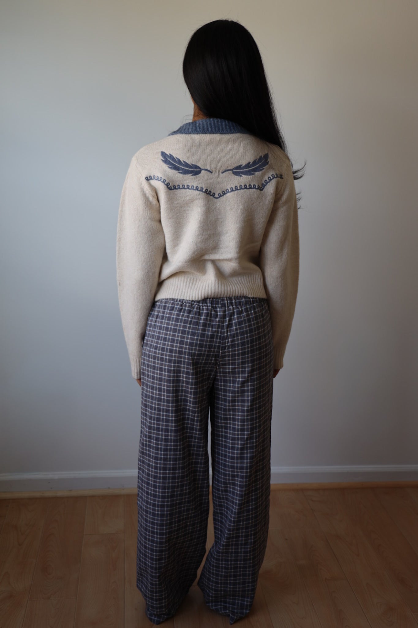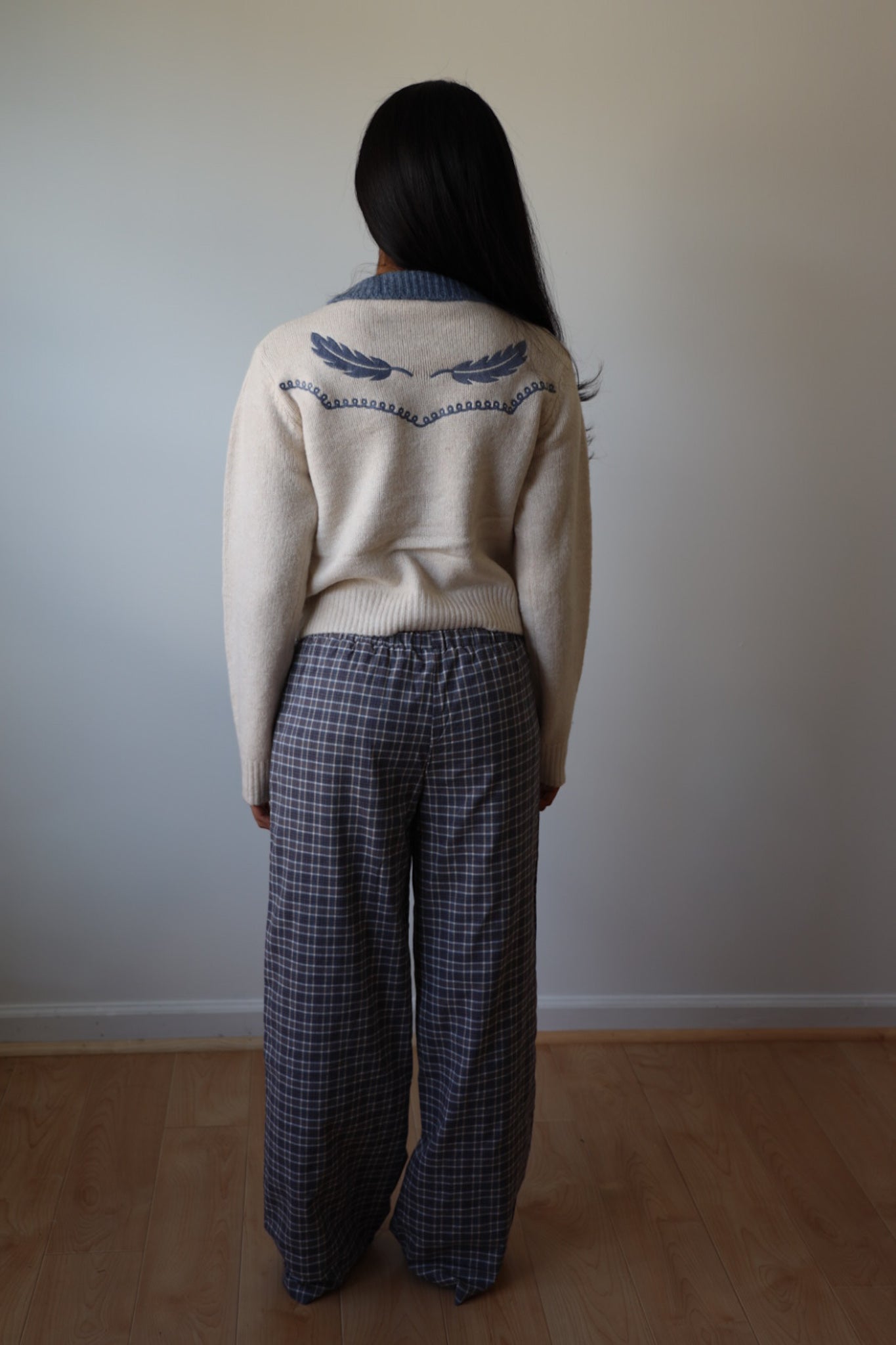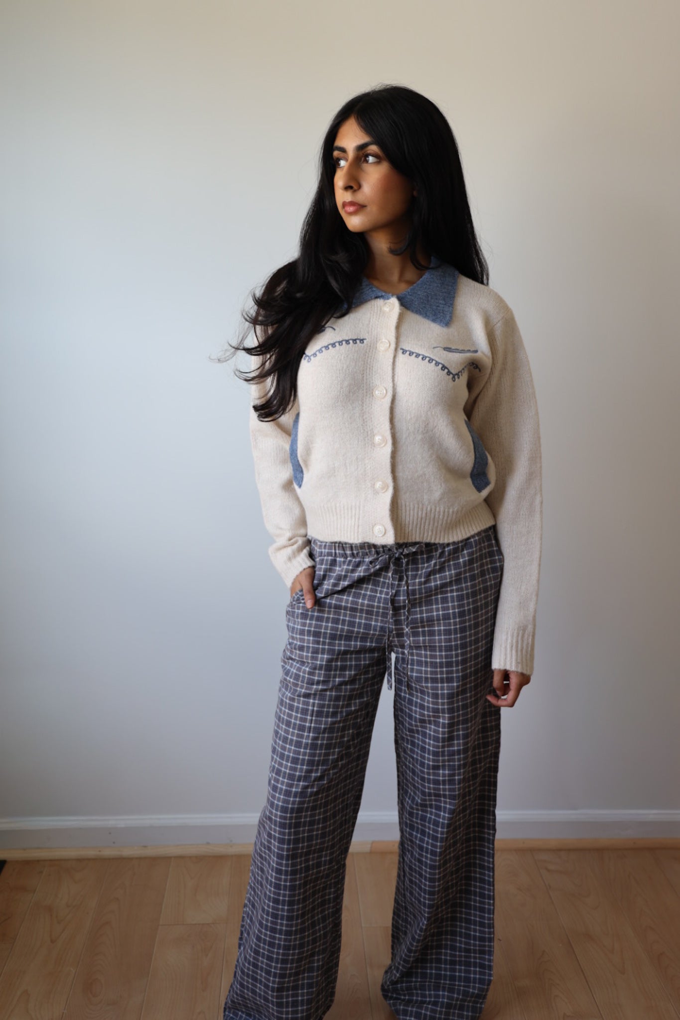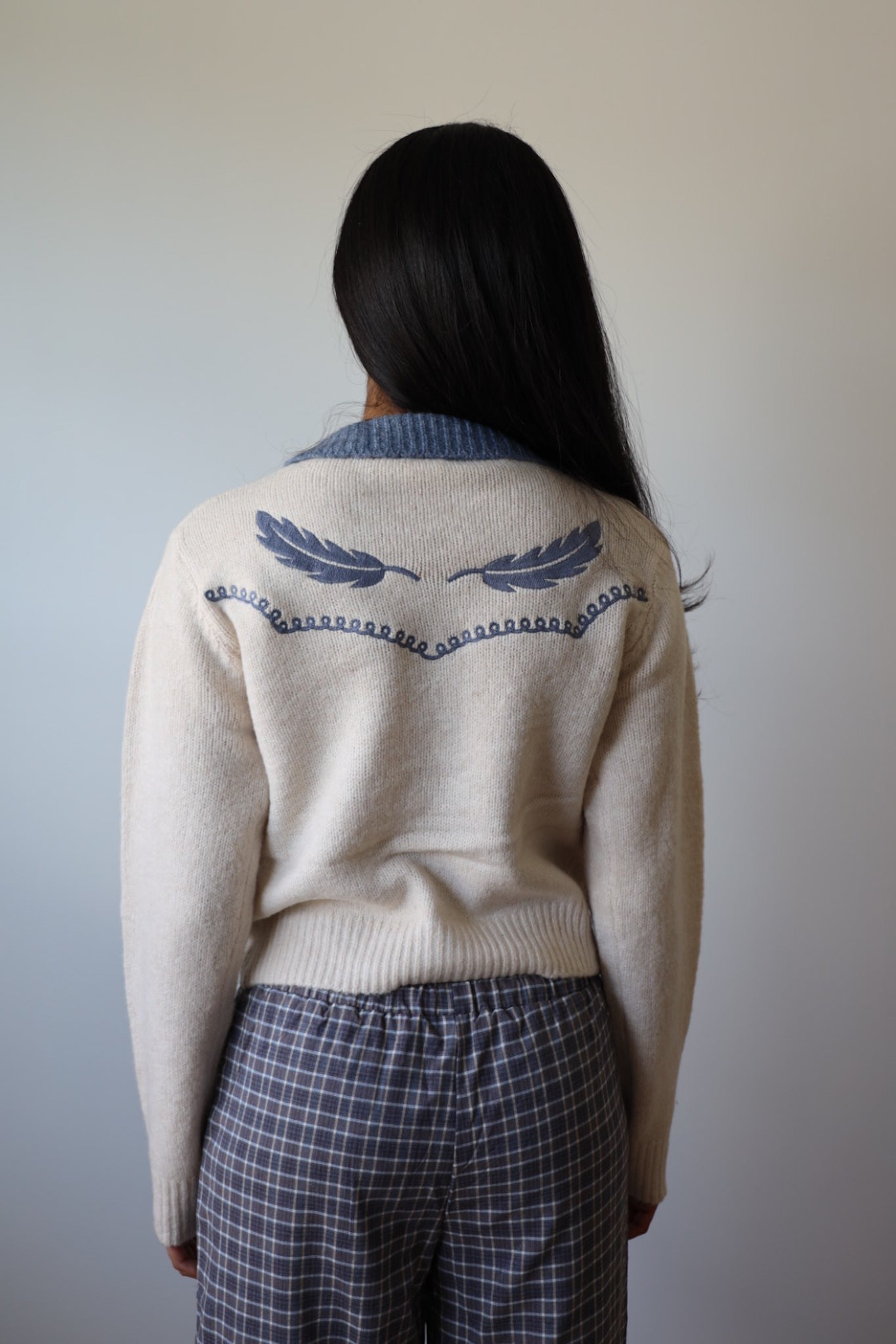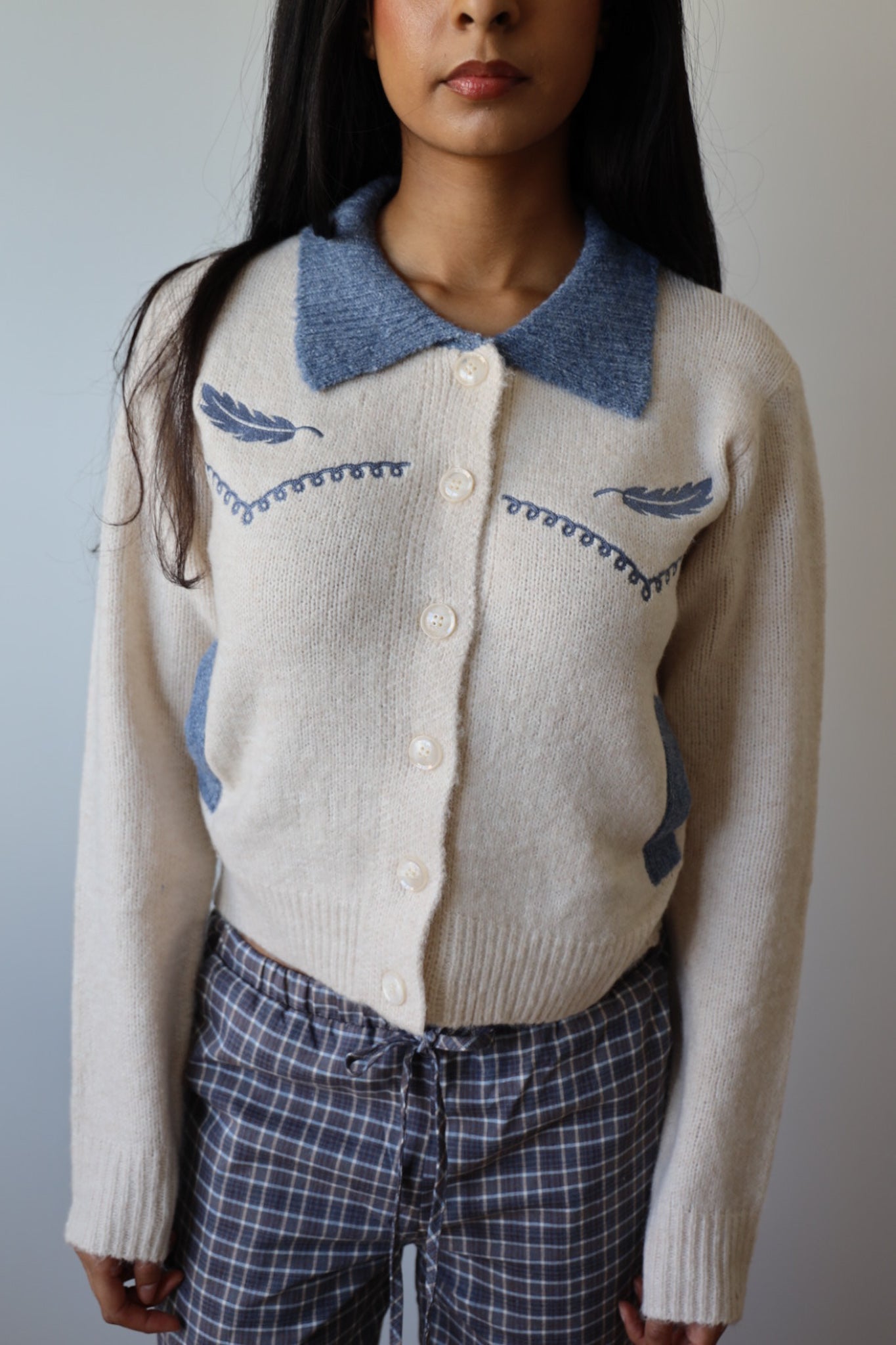 A soft cream cardigan with denim-blue contrast collar and western-inspired embroidered detailing. Finished with front buttons for a polished yet laid-back vibe — perfect with denim or tailored trousers.