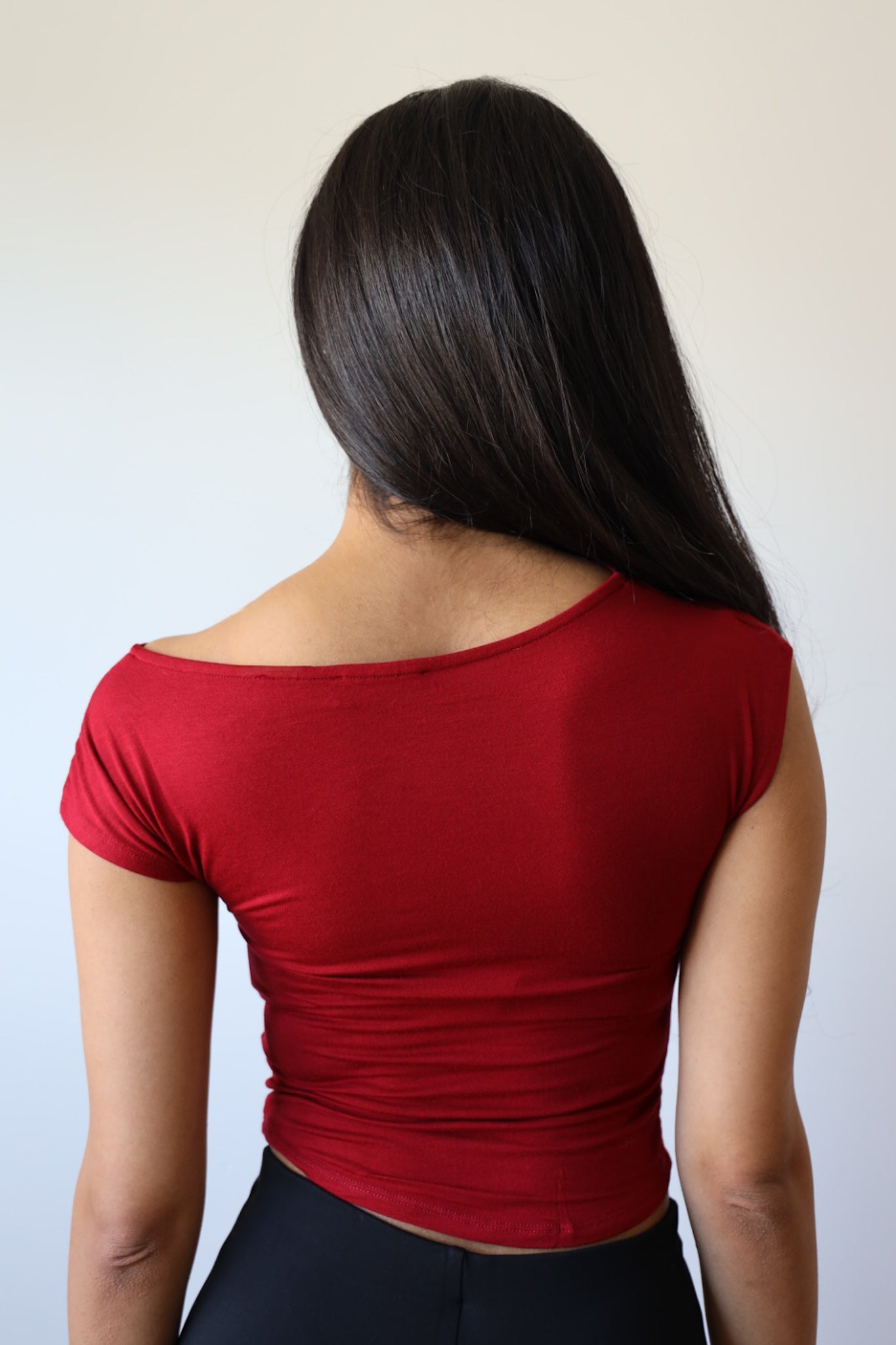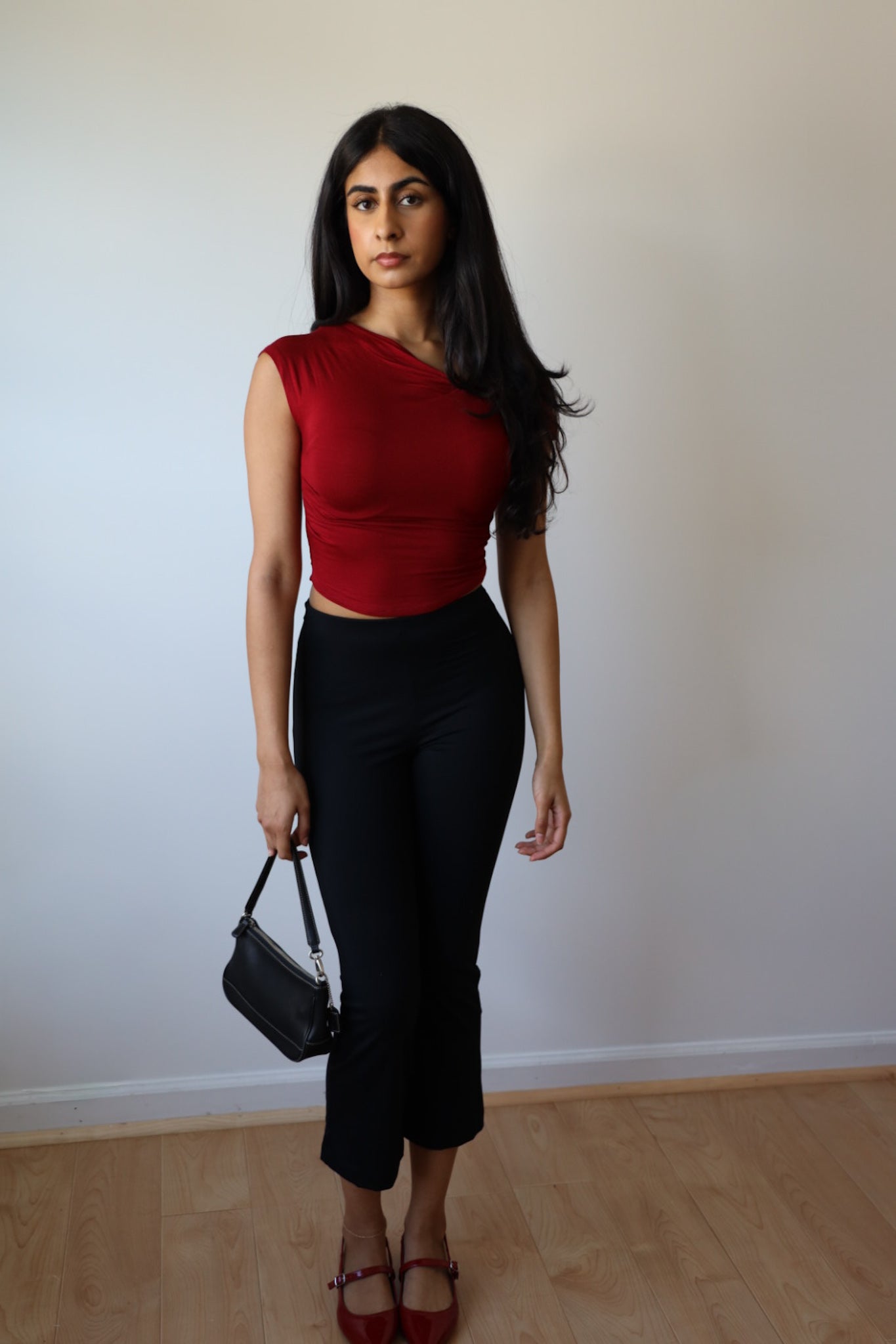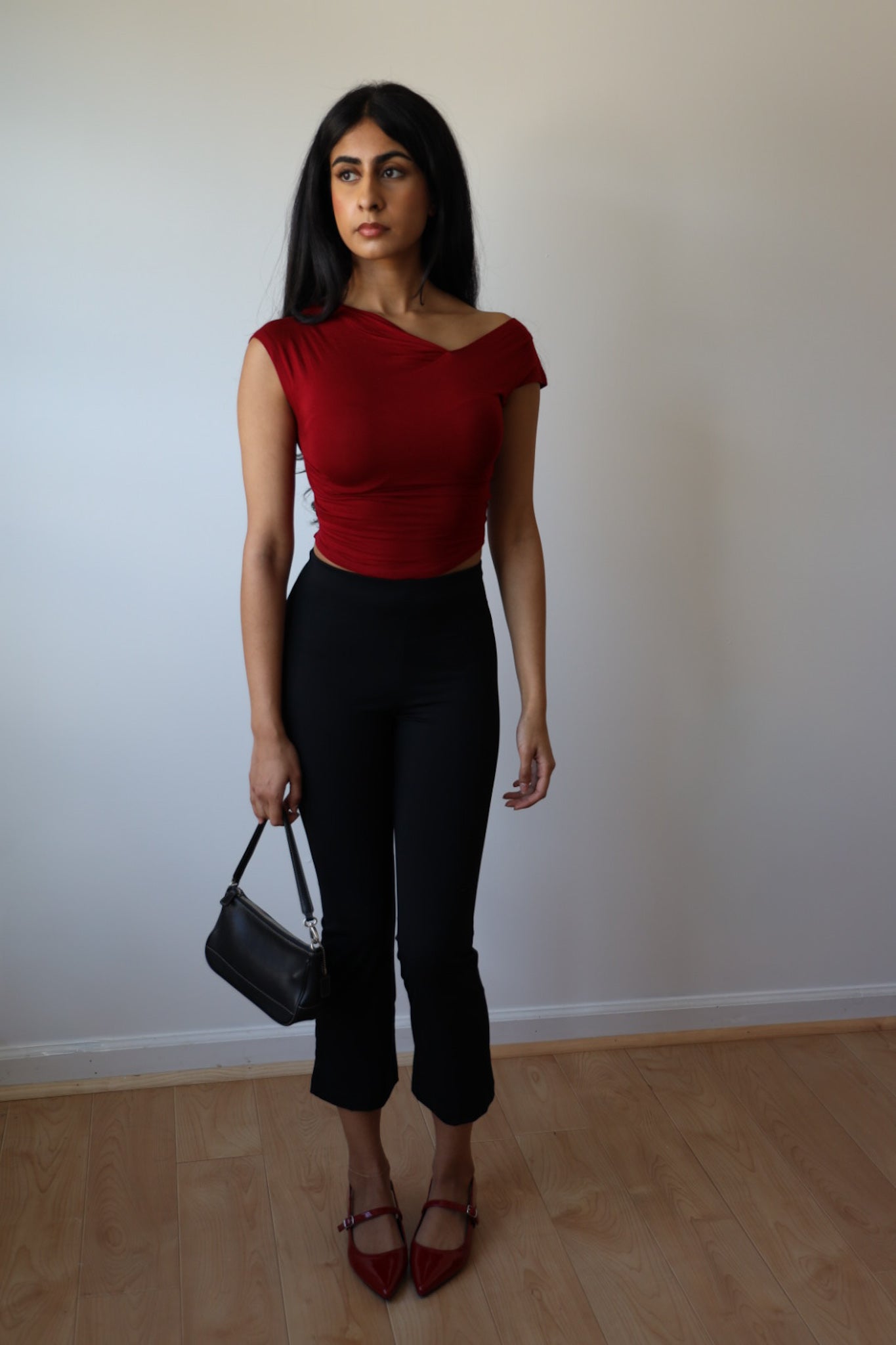 A stretch knit top with an asymmetric neckline and gentle ruching that flatters the waist. A day-to-night essential for pairing with denim, skirts, or wide-leg pants.