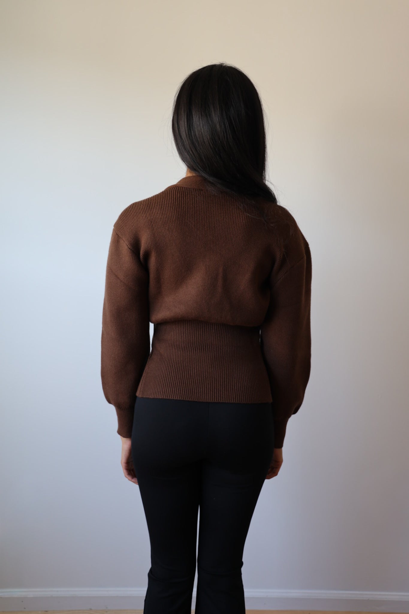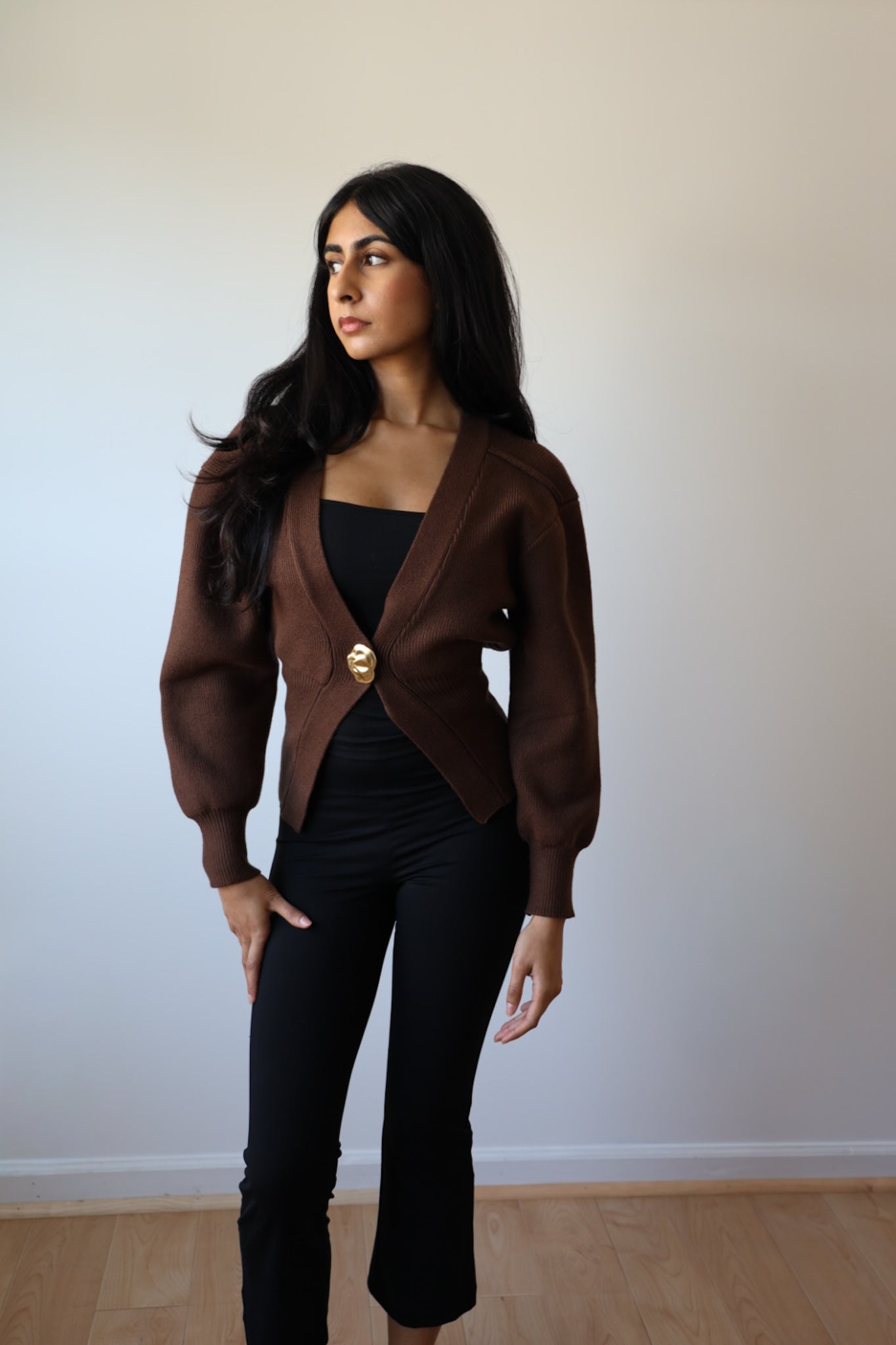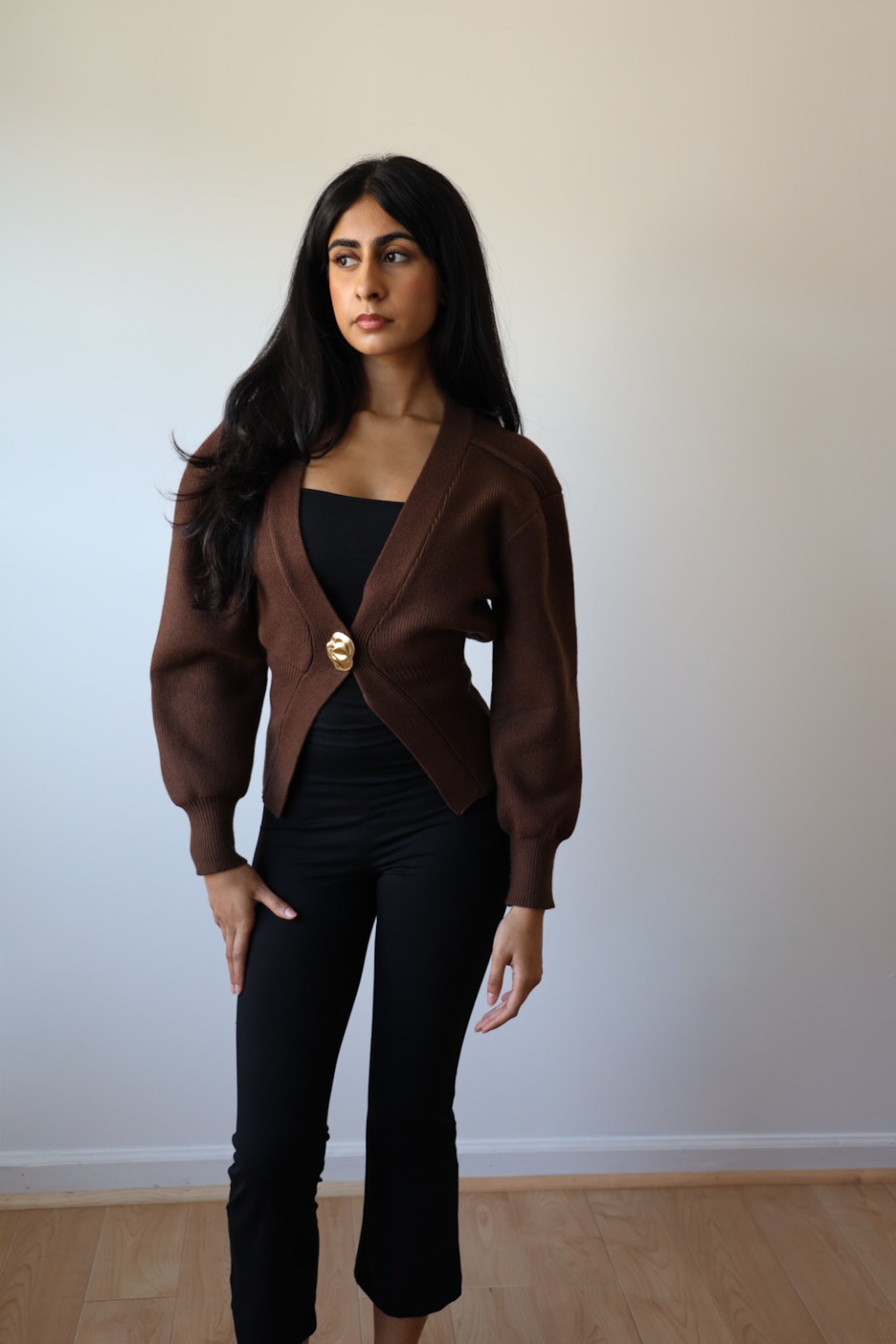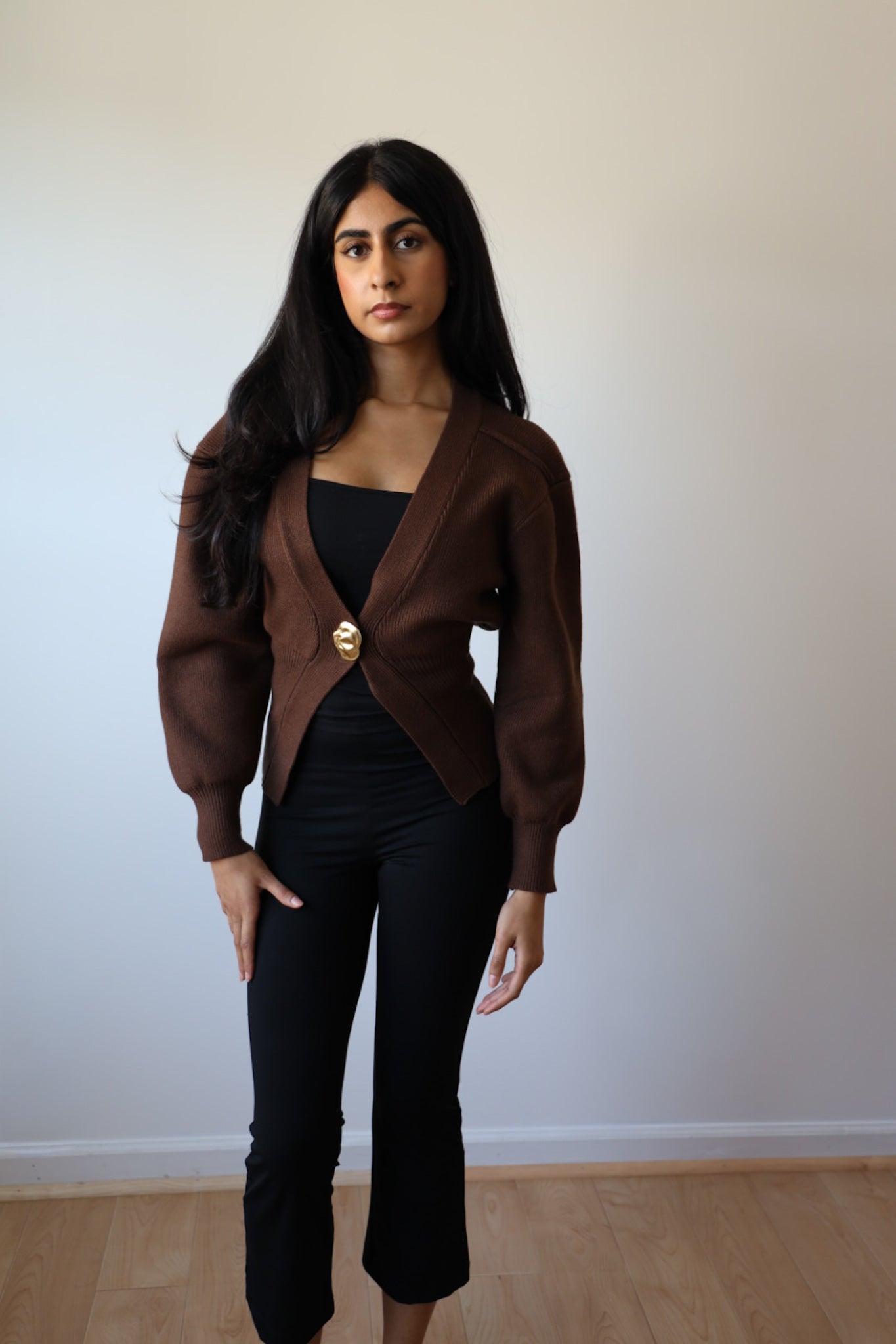 A cropped chocolate-brown cardigan with sculpted balloon sleeves and a single bold gold button. Chic worn on its own or layered over camis and dresses.