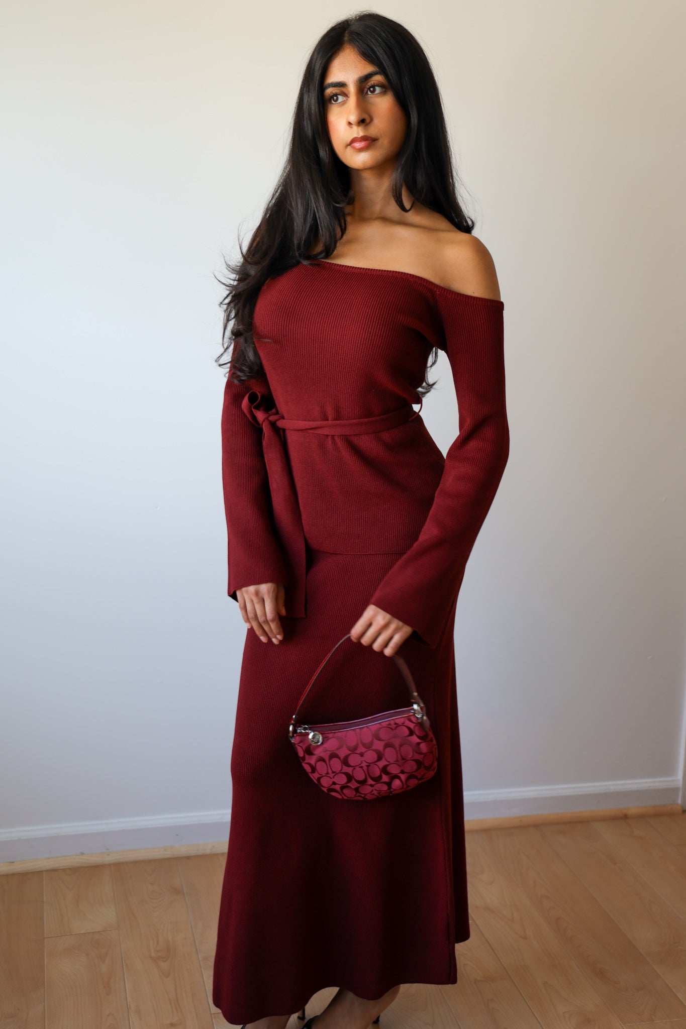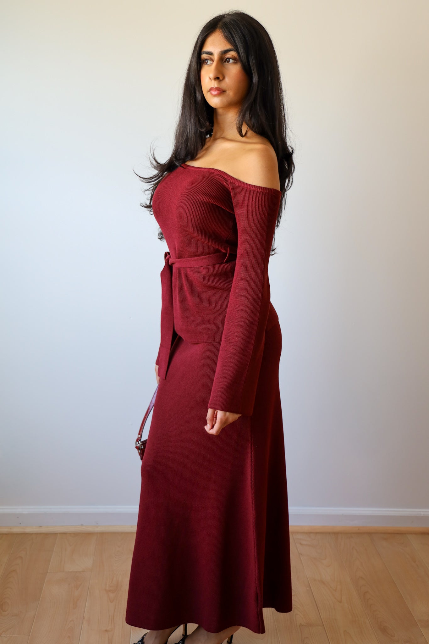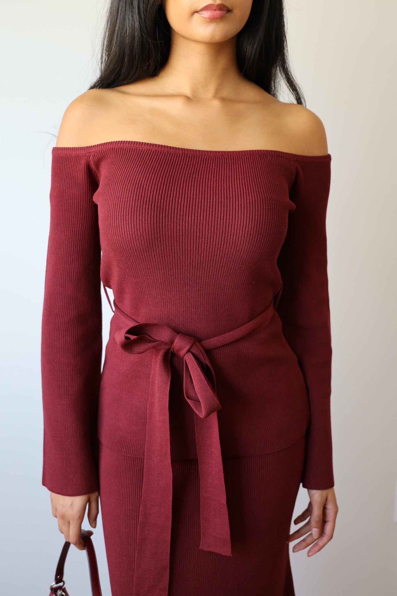 A rich burgundy knit top with a flattering off-shoulder neckline and a self-tie waist belt. Its soft ribbed texture makes it ideal for cool-weather dinners or layering under tailored coats.