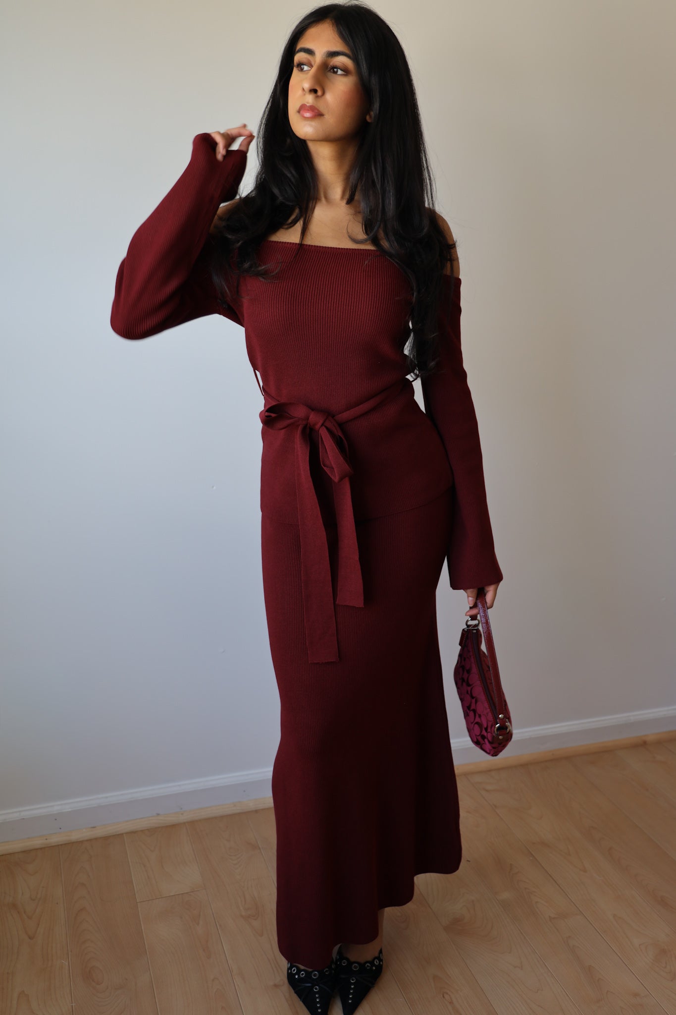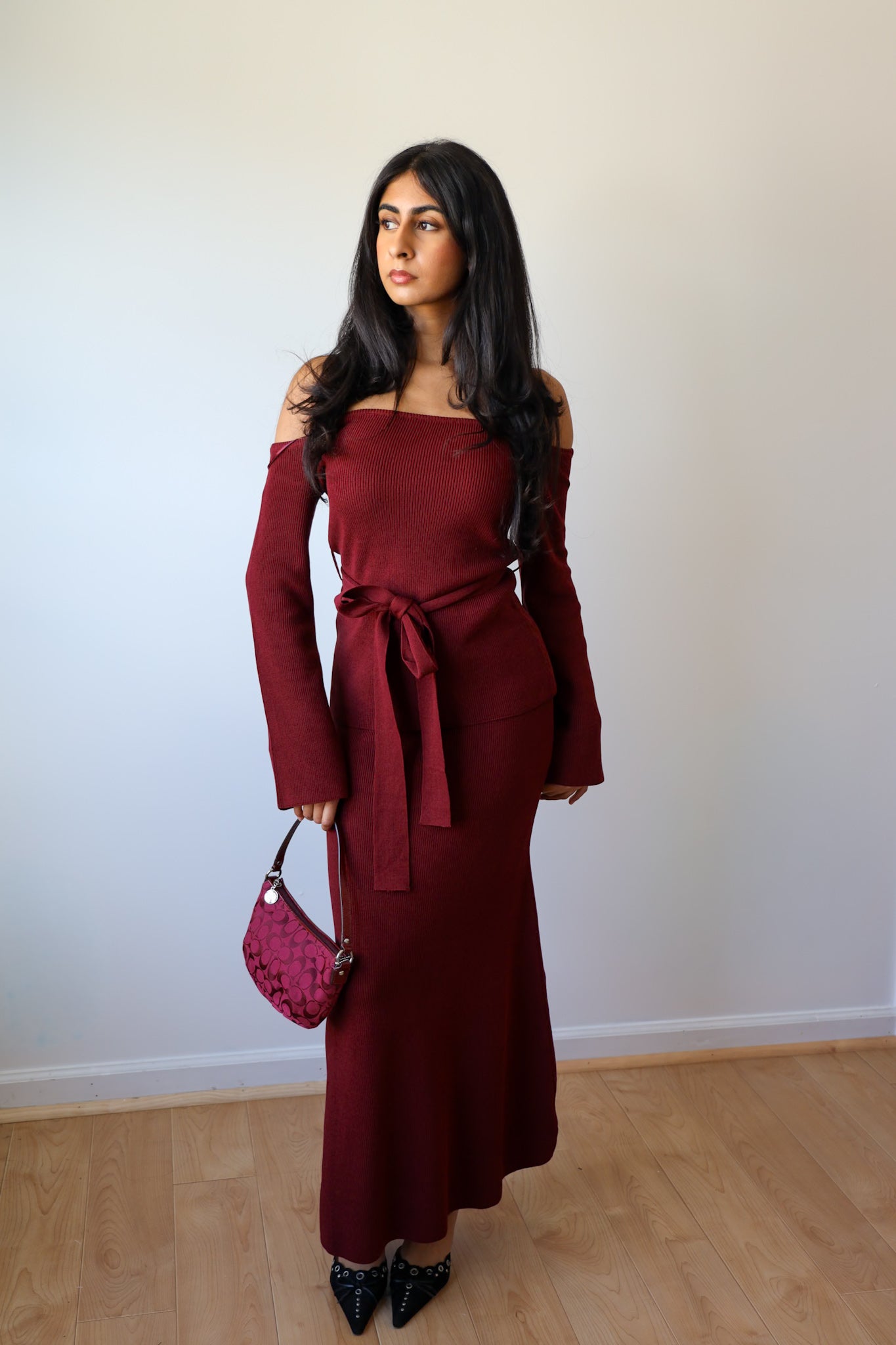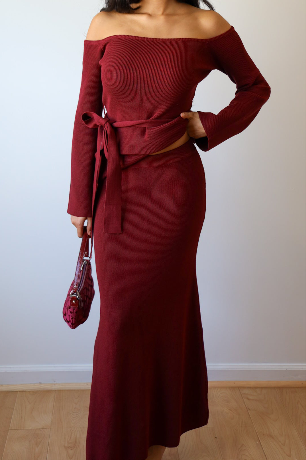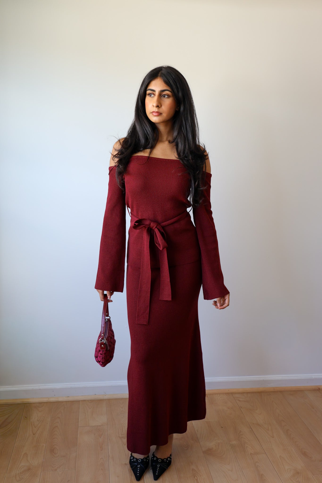 A rich burgundy knit top with a flattering off-shoulder neckline and a self-tie waist belt. Its soft ribbed texture makes it ideal for cool-weather dinners or layering under tailored coats.