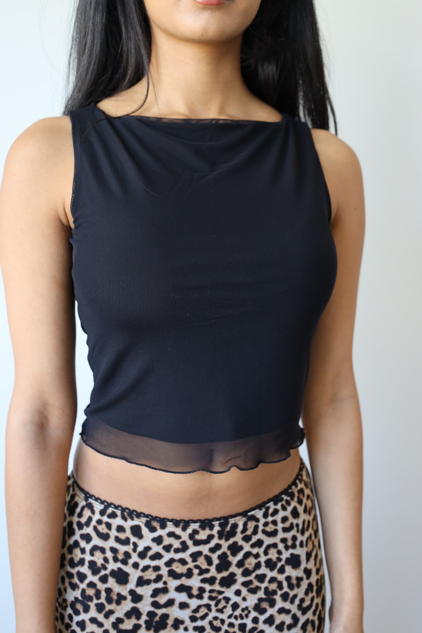Tags: black mesh-trim tank, cropped black tank top, sheer-detail black top, chic black layering top