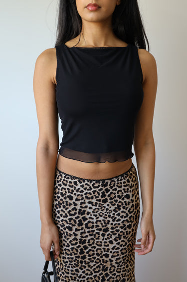 A simple black tank with a subtle sheer hem for a soft, flirty finish. Wear it solo for a night out or layer it under cardigans and jackets.