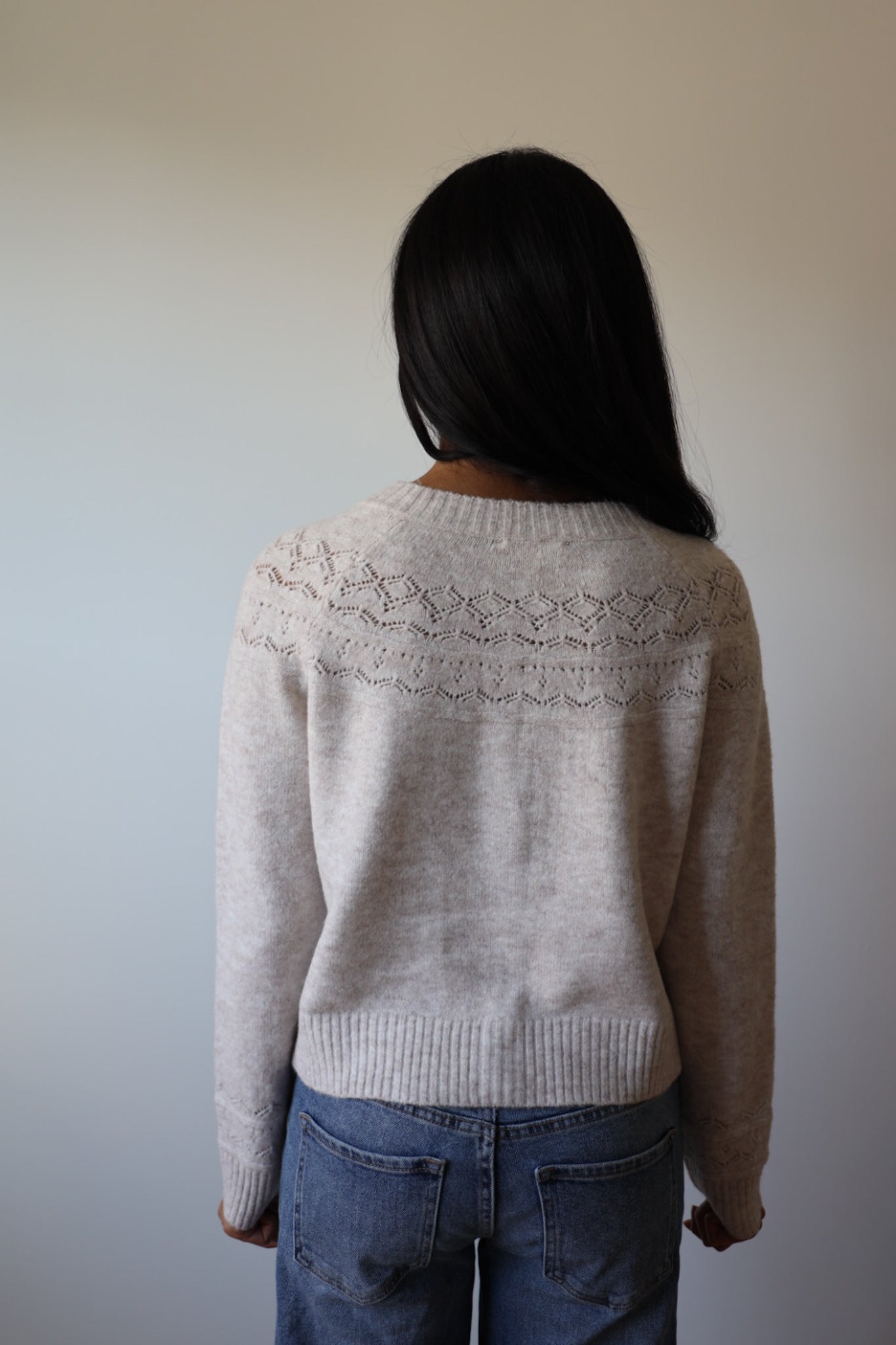A soft, neutral cardigan with delicate knit details and gold-tone buttons. The slightly cropped fit makes it an easy dress-up-or-down layer.