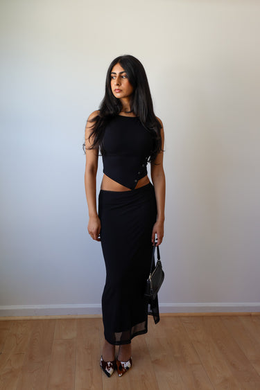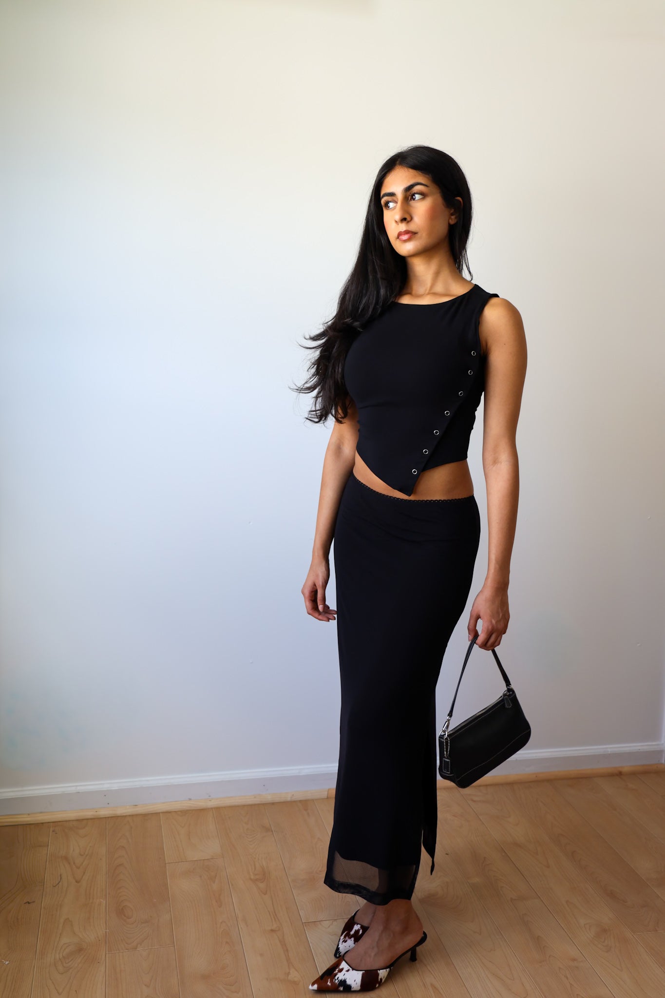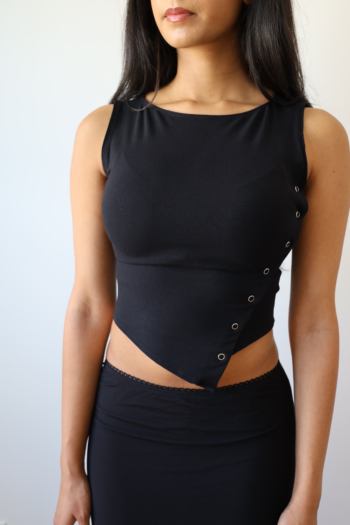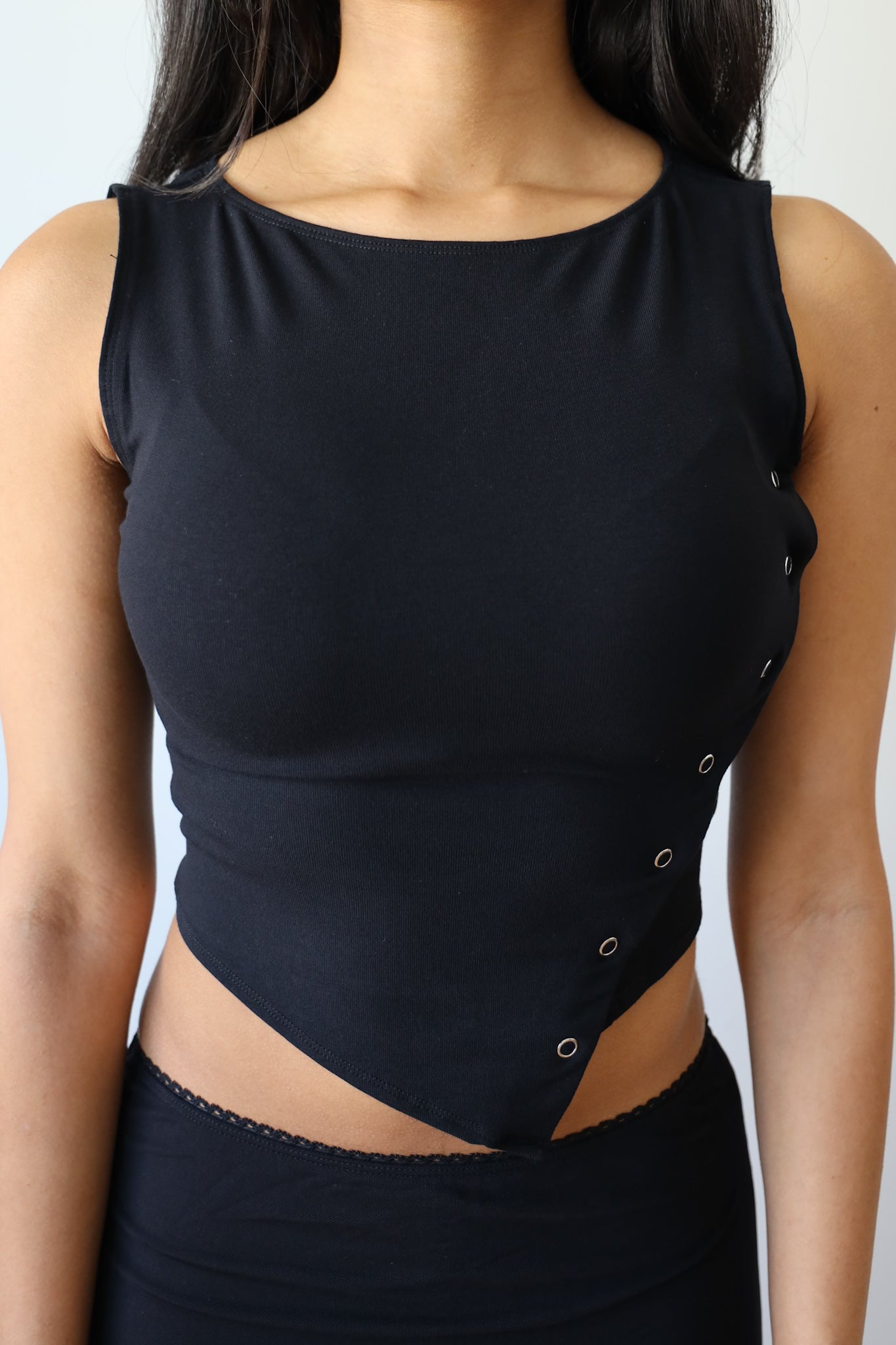 A sleek crop top with an asymmetric angled hem and decorative side button detail. Great for layering under blazers or pairing with high-waist bottoms for fall nights out.