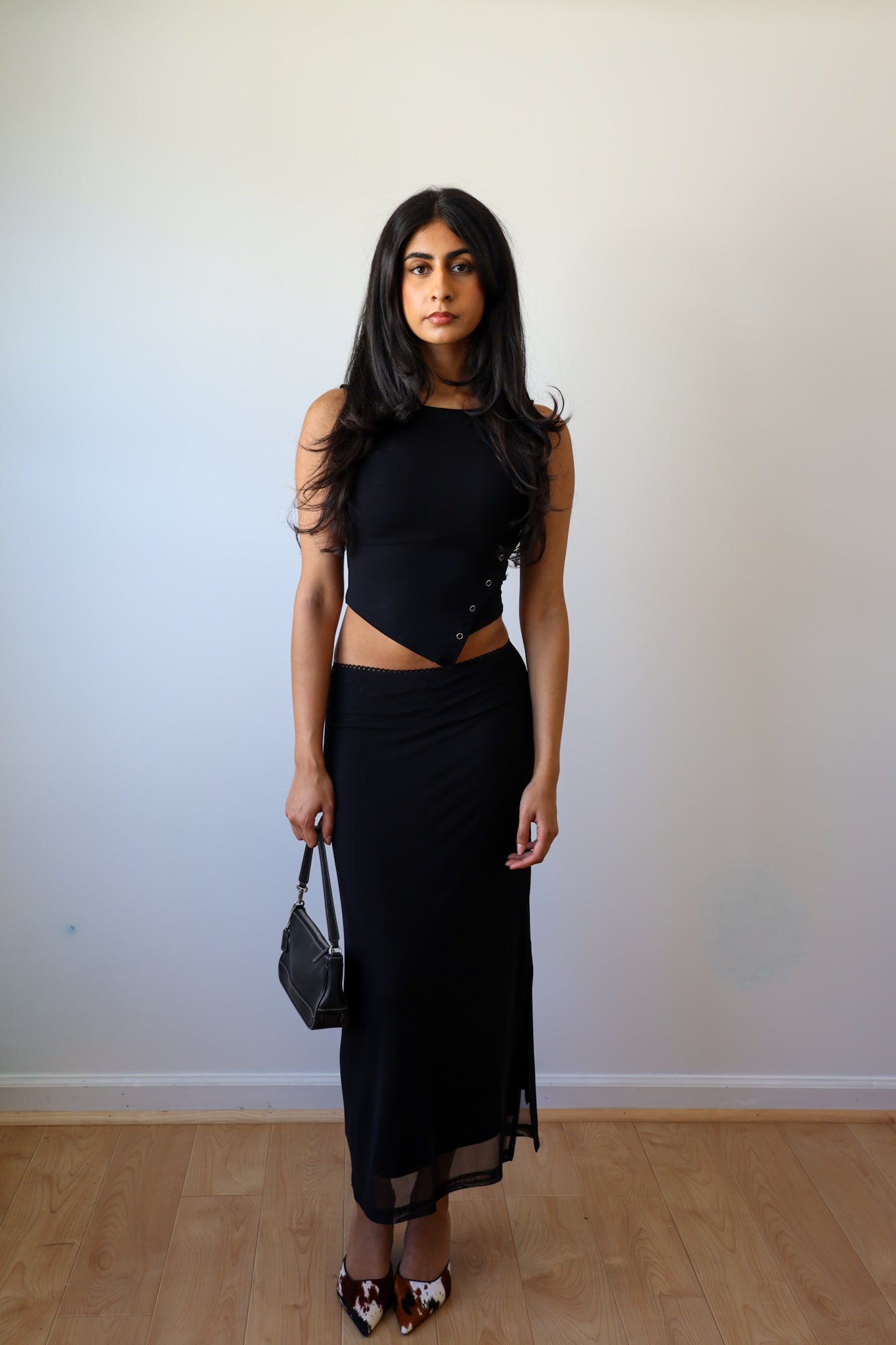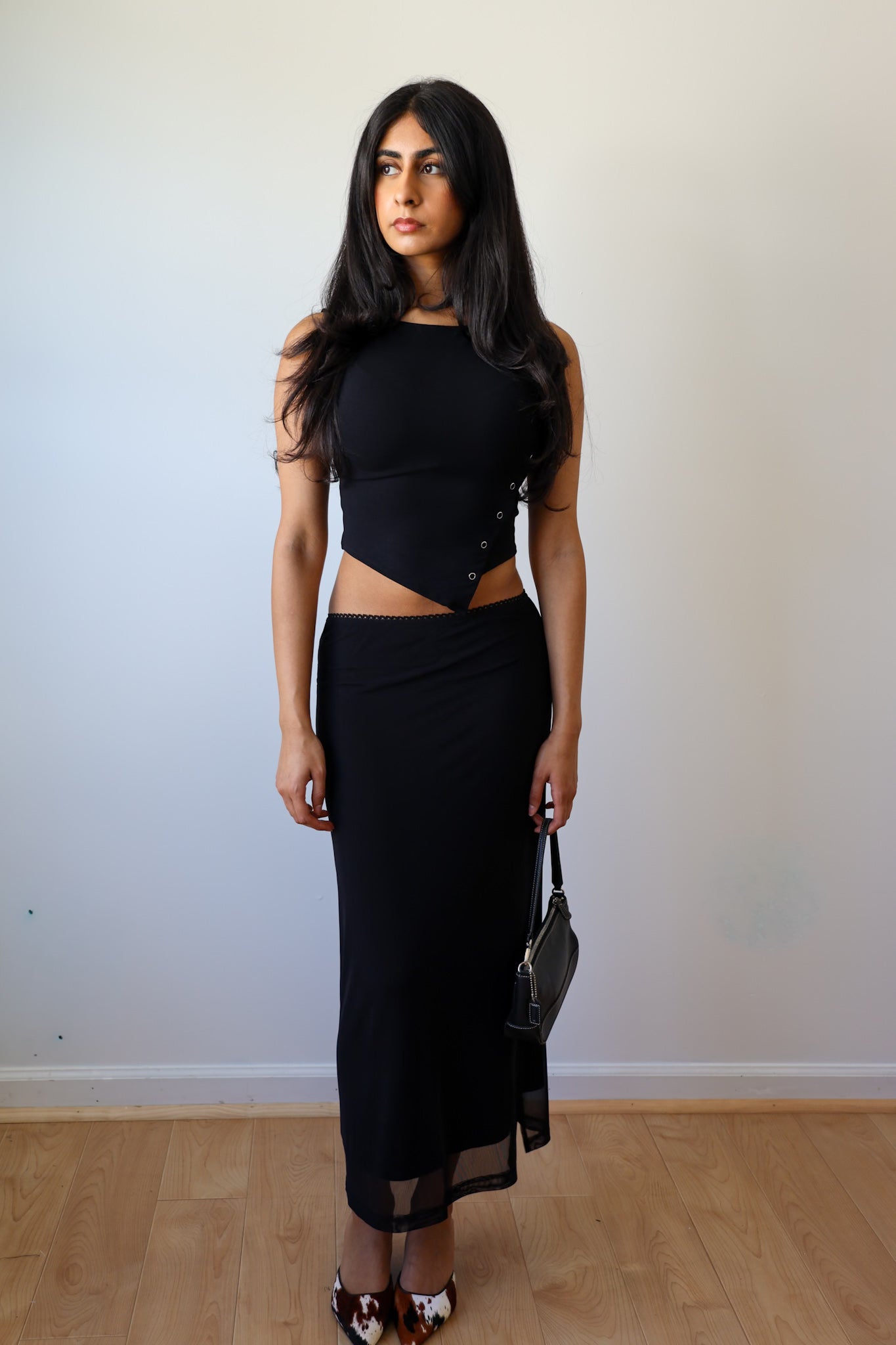 Tags: black asymmetric crop top, edgy fall layering top, winter going-out top